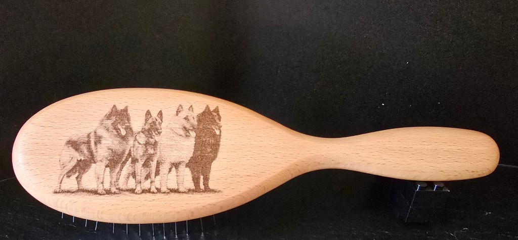 Each brush is made in Germany and laser-engraved in the U.S. with our four Belgians design. You can also have your name engraved on the handle at no extra charge, which makes it a lot easier to keep track of at shows.