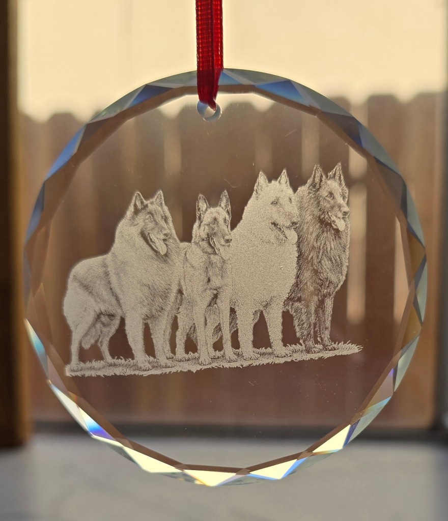 A beautiful 3” faceted crystal ornament engraved with the four Belgian Shepherd varieties. Hang it on your tree, in a window, or display it year-round as a small tribute to the breed we all love.